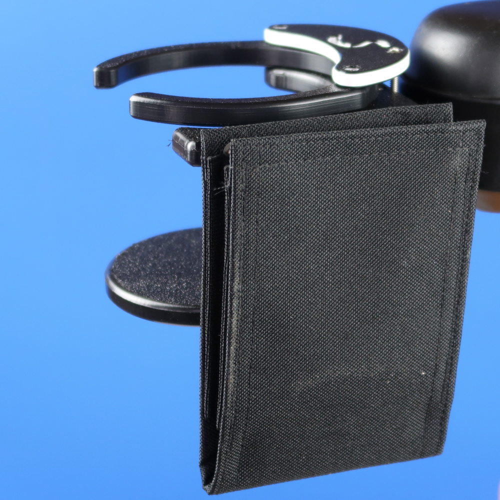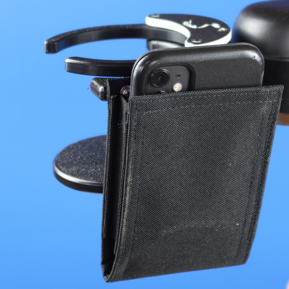 Combo adjustable power chair drink holder with bag style phone holder for left hand applications.