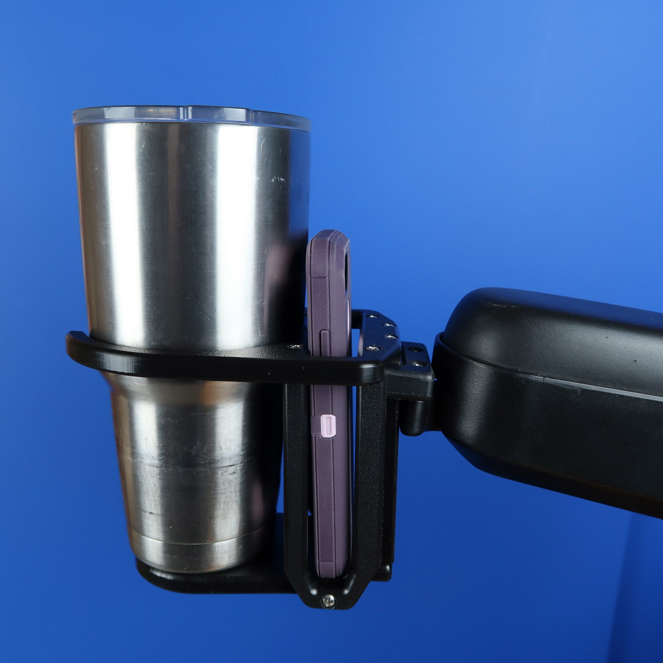 Combo extra large drink and smart phone holder designed for power chairs.