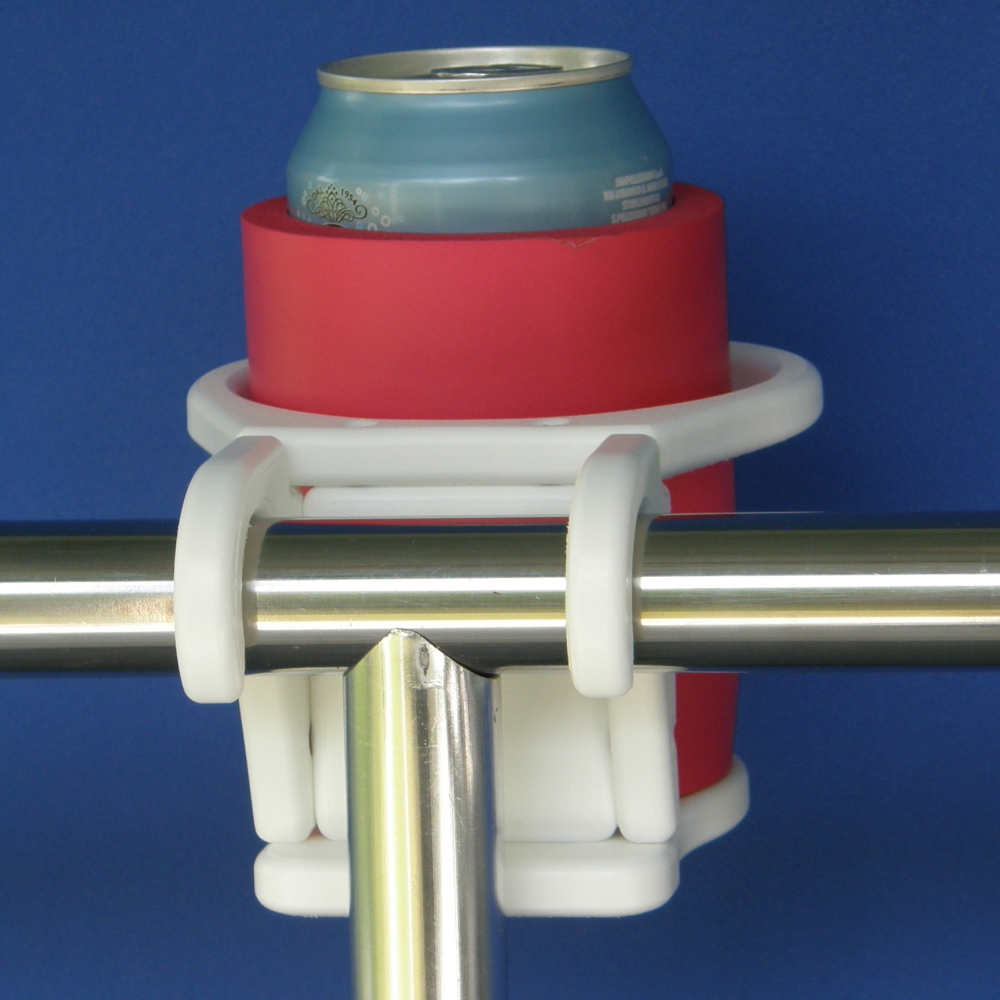 Single horizontal drink holder snaps to horizontal rail at a “T” intersection with a vertical tube.