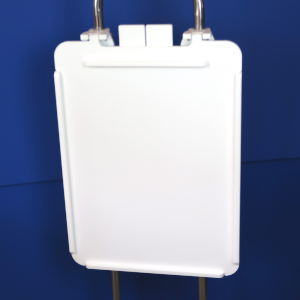 Snaps and clamps onto pedestal guard. Table is self-supporting and folds and snaps in the closed position.