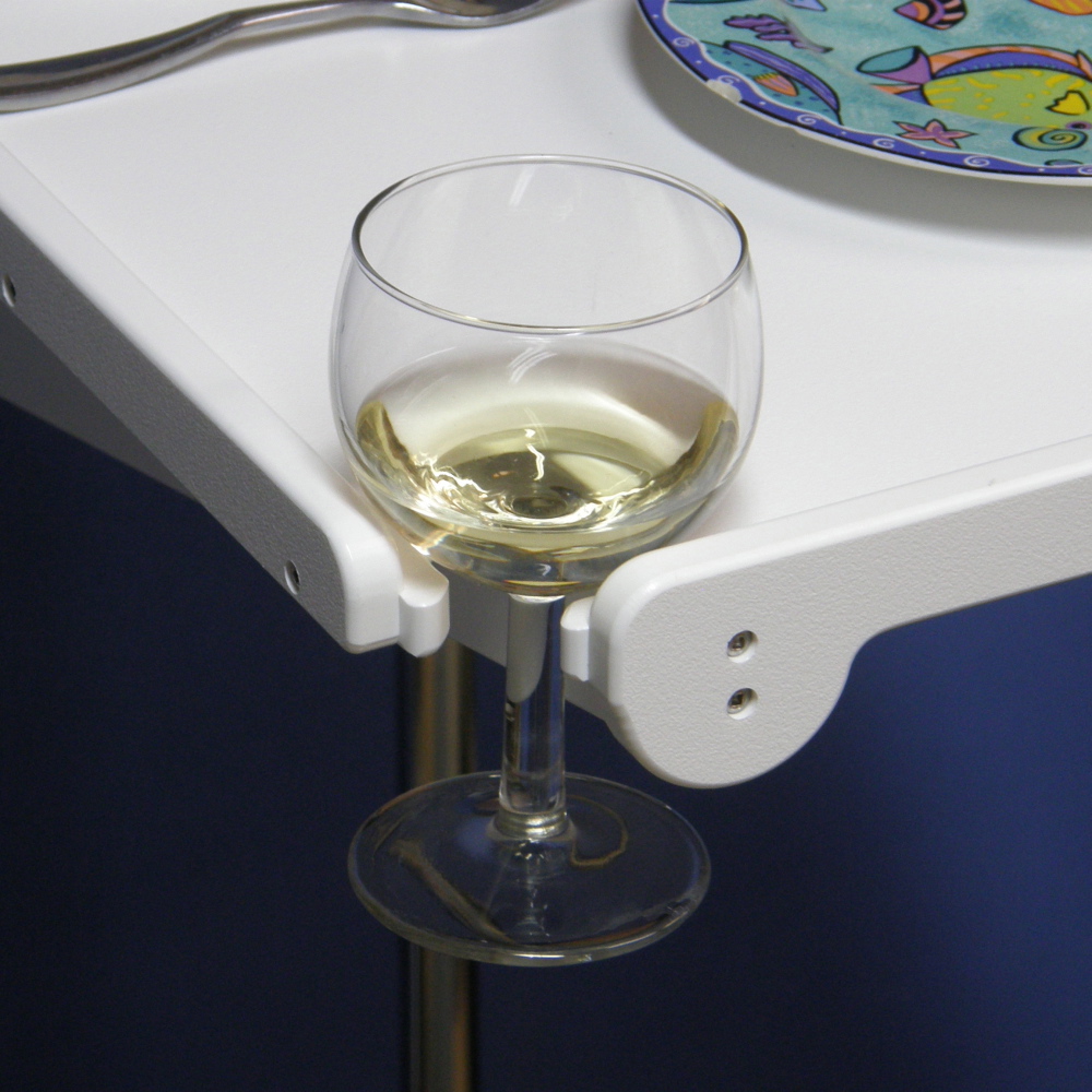 Includes cut outs for wine glasses on the forward end of the table.