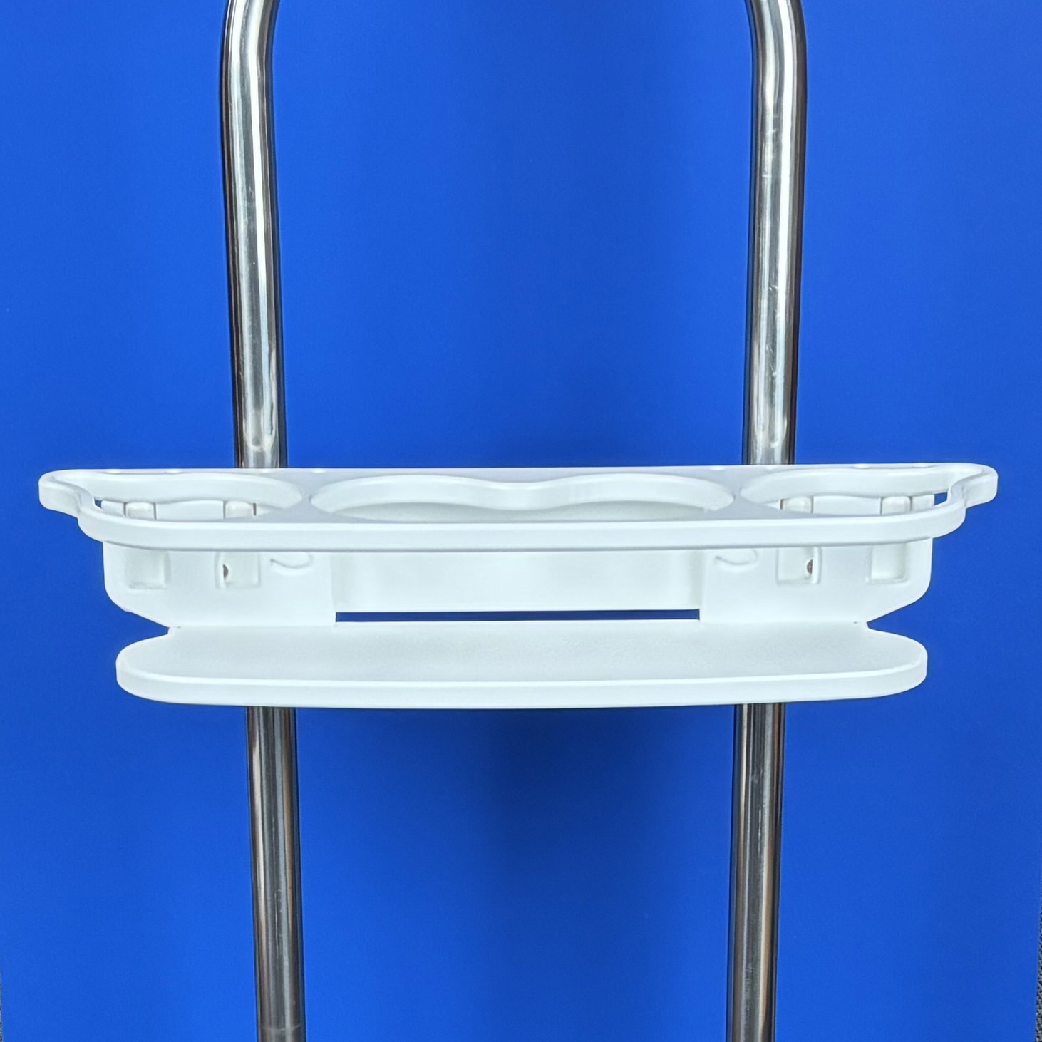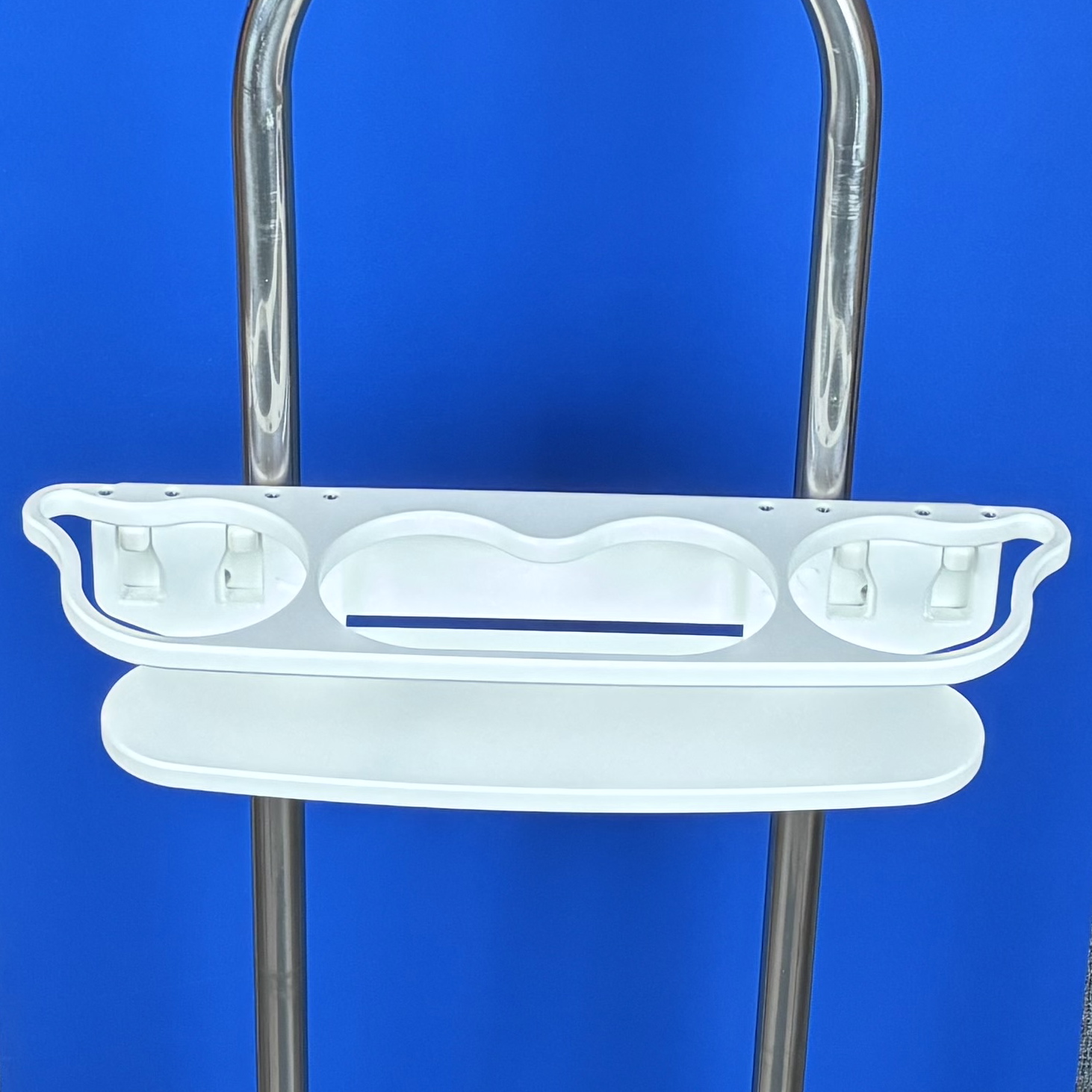 Back edge of drink holder is flush with forward edge of pedestal guard tubes.
